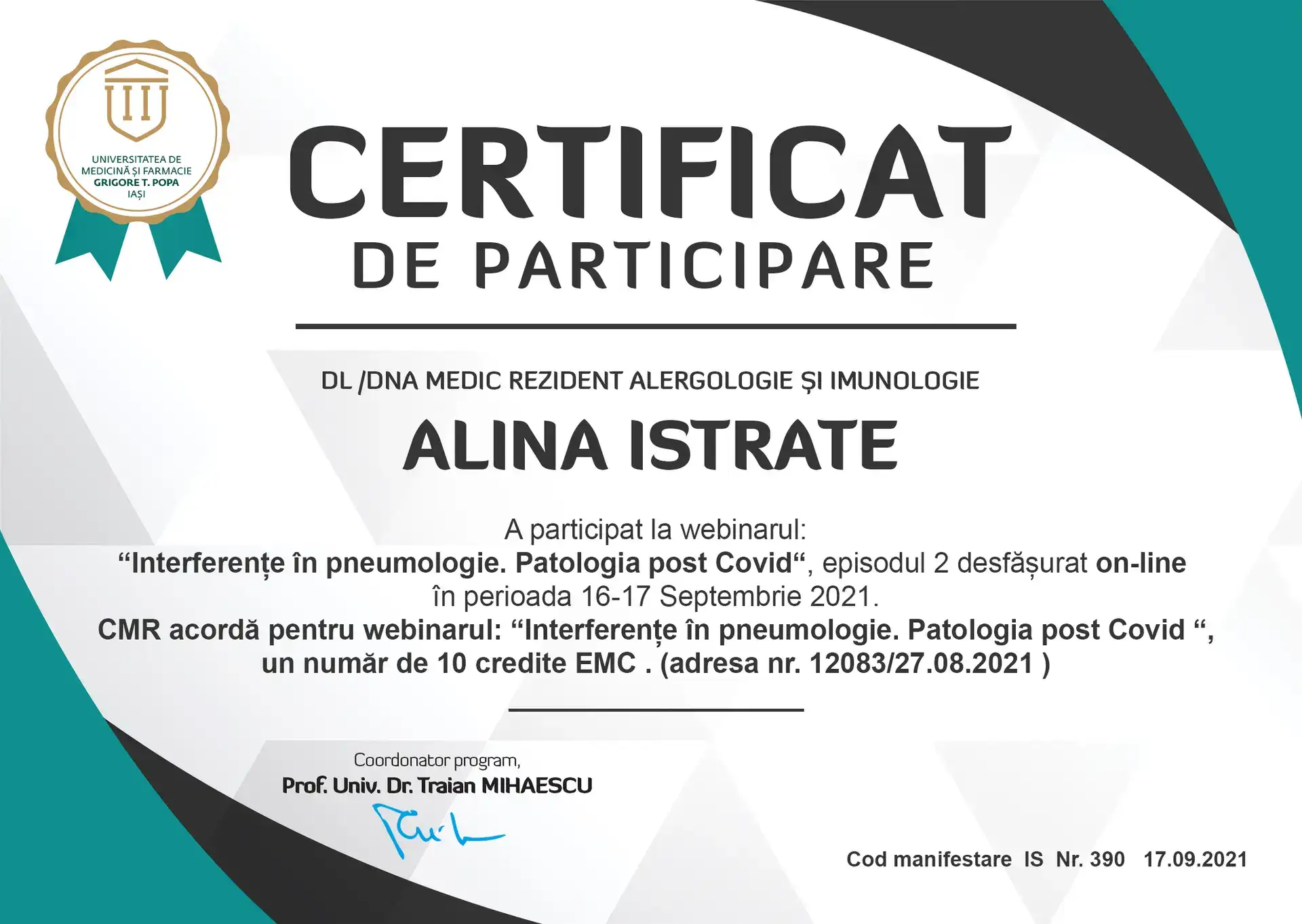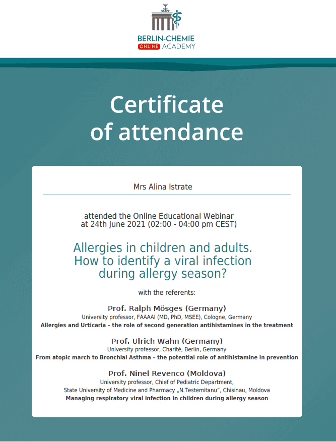 2024 – Formare medicală continuă DEPARTAMENTUL PEDIATRIE – Patologia sistemului respirator și maladii alergice